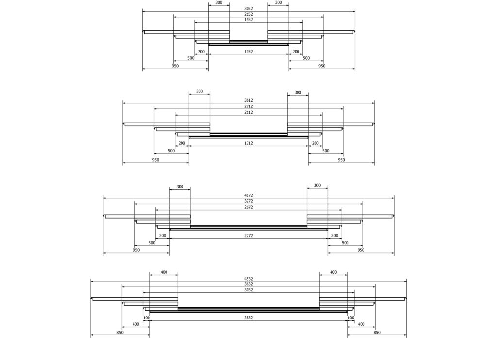 Pituudet 1152, 1712, 2272 ja 2822 mm
